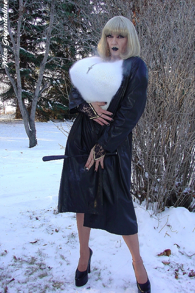 | Miss Gwendoline a big busted naughty trans slut Miss Gwen outside in her long leather coat angora sweater and lingerie going out to play |