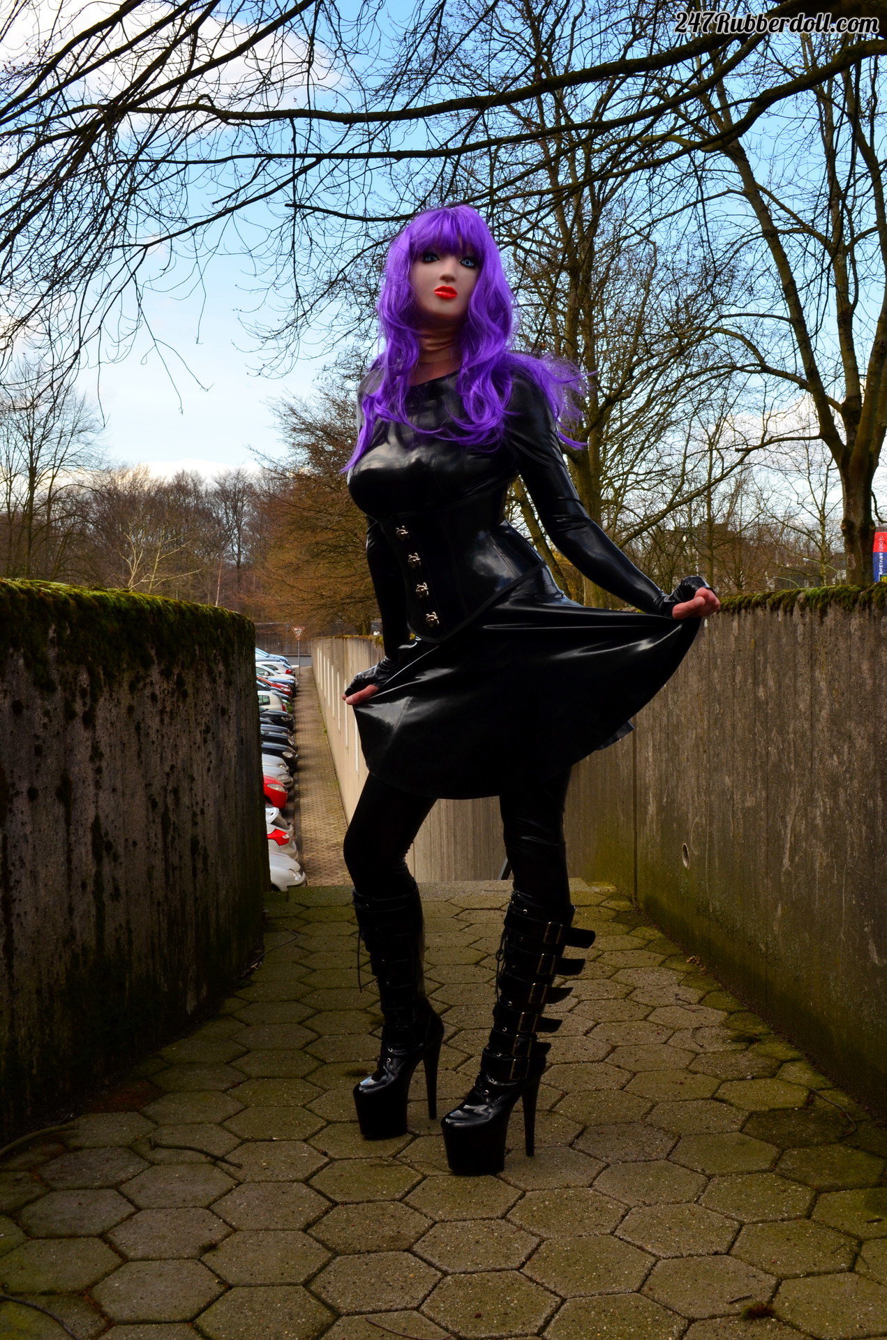 posing outside in boots, tight corset, top and face mask