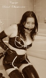 In this hot preview set from BoundObsession Hot sexy lady wearing latex stockings girdle bra gloves and ring gag in hot poses