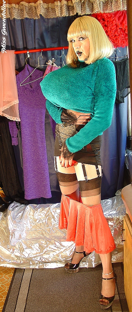 | Miss Gwendoline a big busted naughty trans slut Miss Gwendoline posing in a vintage girdle and soft furry green sweater as she gets ready for a naughty day of pleasure |